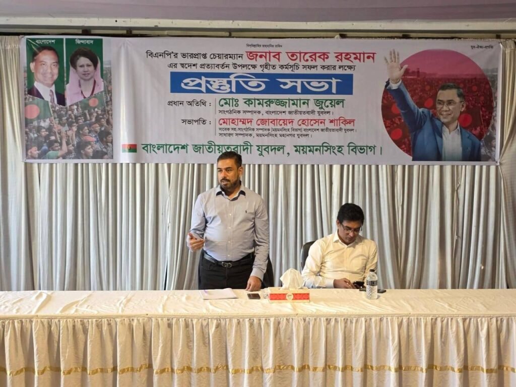 ২২-১২-২০২৫ ইং সোমবার। ময়মনসিংহ বিভাগীয় যুবদল আয়োজিত প্রস্তুতি সভা- বিএনপি’র ভারপ্রাপ্ত চেয়ারম্যান জনাব তারেক রহমানের স্বদেশ প্রত্যাবর্তন…