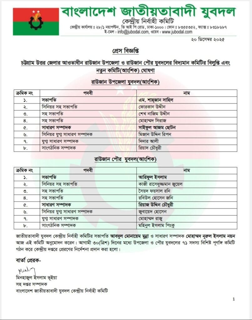 জাতীয়তাবাদী যুবদল কেন্দ্রীয় নির্বাহী কমিটির সভাপতি আবদুল মোনায়েম মুন্না ও সাধারণ সম্পাদক মোহাম্মদ নূরুল ইসলাম নয়ন আজ এই কমিটি অনুমোদন করেন।