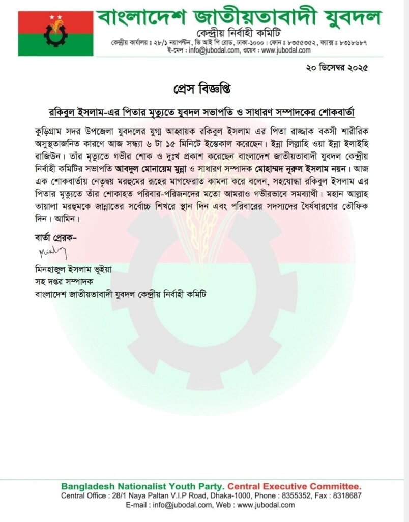 রফিকুল ইসলামের পিতার মৃত্যুতে যুবদল সভাপতি ও সাধারণ সম্পাদকের শোকবার্তা